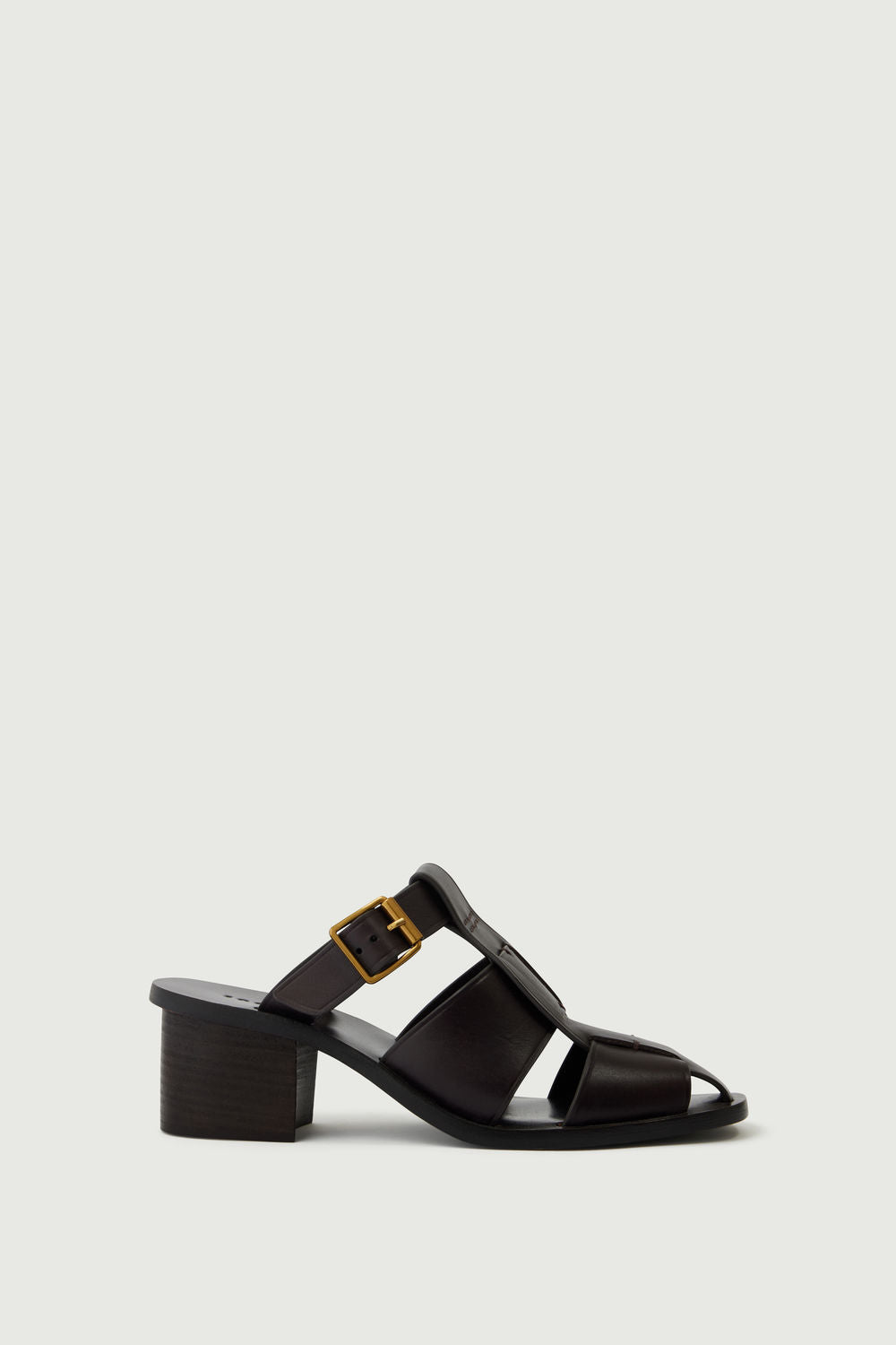 - Wide-heeled mules with a golden buckle